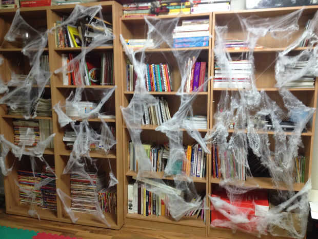Pared, estantes, puertas fueron cubiertas con telas de araña y arañas de plástico (almacén del dólar)