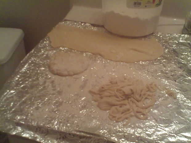De todos modos, ahora alimentan la propagación masa el cortador de espaguetis y saldrán los hilos. Ojala te tuviera una olla lo suficientemente grande como para sostener todos los fideos.