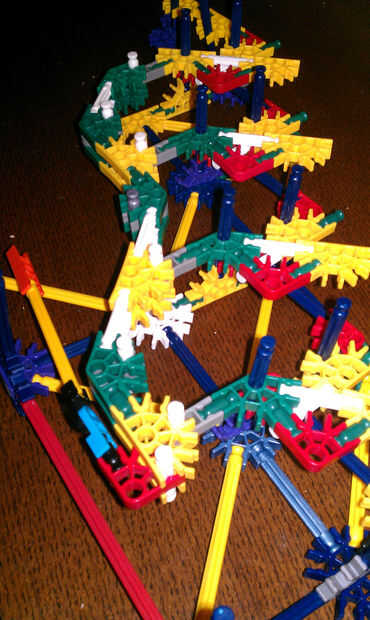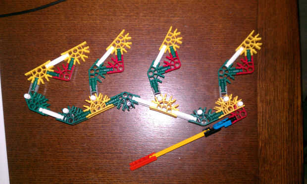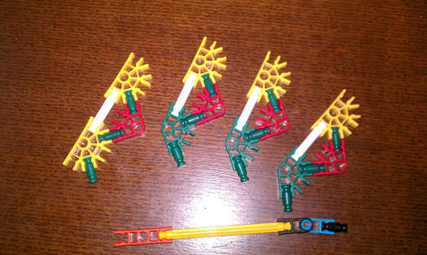 En primer lugar, para crear las piezas en el primer cuadro, entonces, puede añadirlos a principales moviendo el brazo para completar. Cuando haya terminado, coloque los conectores verdes a las barras azules de la estructura, como se muestra en la tercera foto. Debe parecerse a la última foto