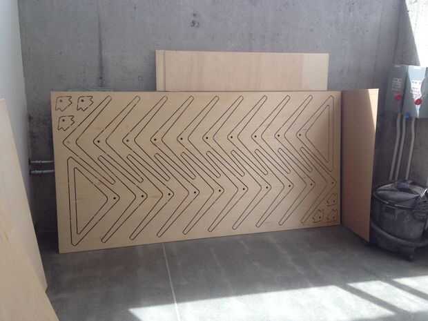 Materiales: Dos hojas de 4'x 8' de 1/2" AC de la capa. piezas de 20-28 Banco pueden disponerse en una sola hoja para el enrutamiento. Con 1" espaciamiento entre piezas, un asiento de amor largo 4' sale a 50 piezas, cortadas de dos hojas.