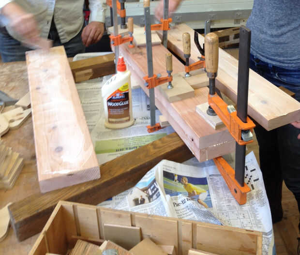 Construir dos bases de pie de 2x4s redwood laminado. Cortar dos de 8 pies 2 x 4 en cuatro piezas de 2'6 "de largo (en esta longitud se extienden más allá de la longitud de 2'1" de los soportes de pie triangular). Aplicar pegamento de madera a la superficie interior de cada pieza, luego sujetarlos juntos hasta que el pegamento de madera seca (al menos unas horas). Plano de las piezas resultantes para un acabado más elegante. Corte una ranura de 1 "x 1" de la línea media en las bases con un router.