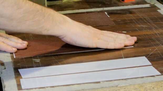 Al principio necesitaba aplanar la parte inferior para que lo nivelada. Una buena manera de lograr esto es pegar papel de lija sobre una superficie torneada como una placa de vidrio o un trozo de encimera. Até con cinta de doble cara pero adhesivo en aerosol funciona igual de bien si no mejor aún. Necesita mantener el avión lo más recto posible cuando usted la empuja sobre el papel de lija o usted conseguirá un fondo inclinado. Usé grano 80 para este paso. Luego puedes ver donde tienes los puntos bajos. La superficie tiene que ver el mismo en todas partes.