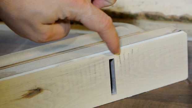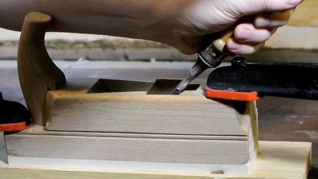 Ahora que la nueva suela había cerrada la boca viejo necesitaba crear una nueva con un cincel. Utilizando el cincel con el lado inferior hacia el cuerpo sería comprimir la madera que va a eliminarse y así dejarlo trabajar contra usted. Por lo tanto es necesario primero crear un espacio. Esto se hace por tener cara de inferior de cincel que el agujero mientras que usted toque a lo largo de las caras internas de la boca. Tan pronto como he creado una ranura en el medio podría dar vuelta el cincel para dejar que se deslice exactamente a lo largo de la abertura de la boca vieja. Con la nueva desembocadura podría empezar a nivel de la planta del pie. Traza la marcas en la parte inferior me ayudó a identificar los puntos bajos después de un pase con 80 papel de lija de grano. Debe continuar hasta que hayan desaparecido todas las marcas de lijado. Luego hice pasadas adicionales con grano 120 y 250. Los lados del plano se alisaron junto a. Todos los bordes están muy afilados después de dicho tratamiento y dejarán marcas si utiliza el avión como este. El borde delante de la boca debe estar tan afilada como sea posible para mantener la madera procesada hacia abajo como cerca de la hoja como sea posible. Como se enfrenta fuera del plano típico movimiento dirección no deja cualquier arañazos en la superficie. El borde opuesto fue ligeramente redondeado con una lima fina. Pasadas de lija redondean los bordes exteriores.