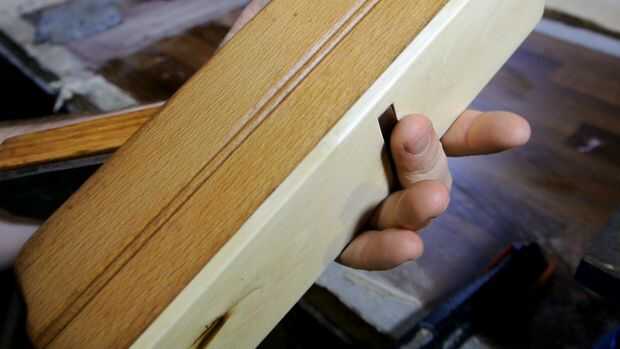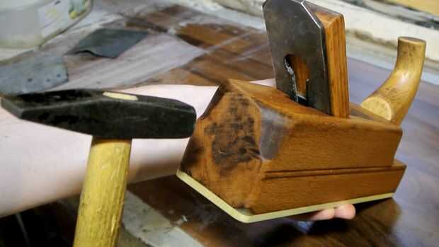 Algunas personas les gusta poner el dedo en la boca cuando inserte la hoja. Simplemente colocar cuerpo del avión sobre una pieza de madera recta suave. Deslice la cuchilla en la parte inferior de la boca con el triturador de viruta hacia arriba. Para obtener la cuña para un ajuste apretado. Algunos pocos golpes suaves con un martillo son absolutamente suficientes.
