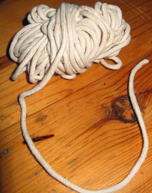 Se trata de una mecha de 3mm. En mi caso uso algodón 3 mm ' cable de baloncesto "que encontré en una ferretería. Pero usted puede torcer la mecha de hilo de algodón ordinario, ver cómo. Si es demasiado fina, la llama no tendrá el poder de fundir toda la cera (líquido de cera a una temperatura mayor que la parafina) y hará un agujero en él, si está muy espeso, que la vela se quema demasiado rápidamente. Así que el tamaño es importante.
