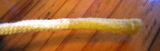 Sumergir la punta de la cuerda de la cera fundida y dejar secar. Esto hará que sea sólido y duro. Afilar la punta (con el dedo) para rosca en los soportes. Dejar distancia entre los soportes. Sumerja el cordón en la cera.