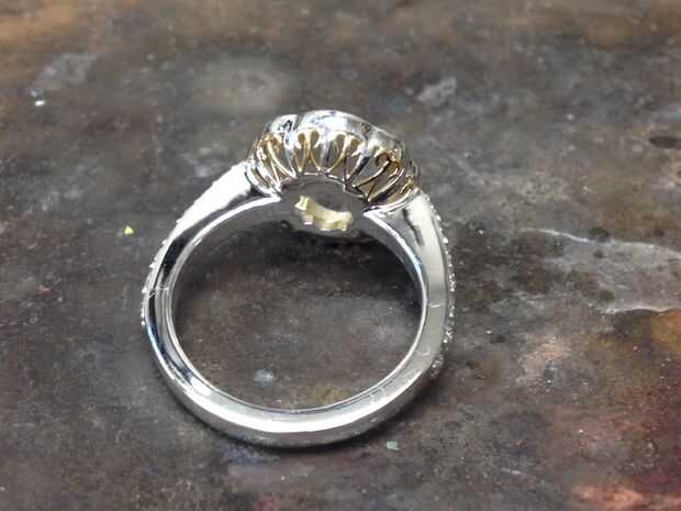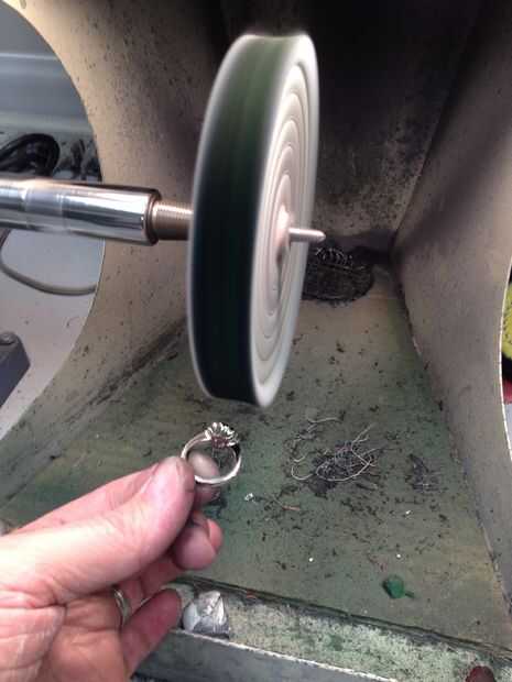 Una vez que las piedras eran conjunto el anillo fue dado un pulido final con un rouge compuesto y esto fue seguido por el anillo en una solución de rodiode la galjanoplastia. Galjanoplastia del rodio consiste en limpiar primero el anillo en una solución de electroclean , seguido por un enjuague con agua y luego el baño de rodio, seguido de otro enjuague con agua. La electrocleaning y baño de rodio se realizan en torno a 5V con un rectificador con un tiempo de un minuto para el electrocleaning y unos treinta segundos para el baño de rodio. Después de retirar el anillo del baño de rodio tiene un acabado blanco muy brillante.