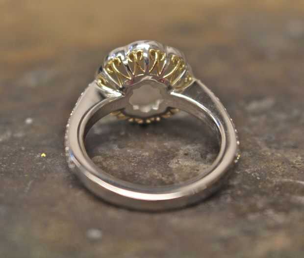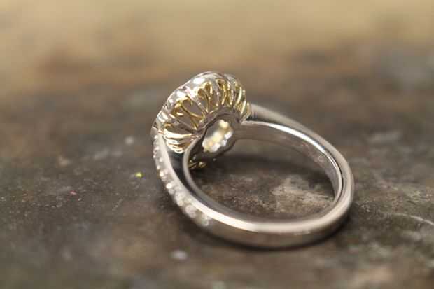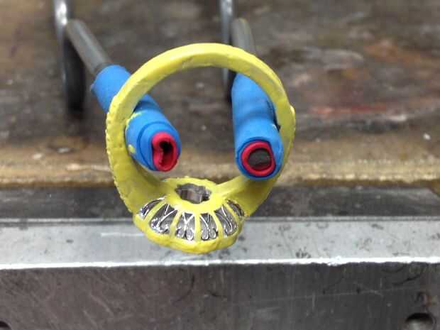 Al discutir el diseño con el propietario se decidió a la placa los cables curvos pequeño en la parte inferior del amarillo anillo para tener el diseño de lazo con la parte superior del anillo antiguo. Los cables podrían han sido hechos de hilo de oro amarillo y soldado en pero que habría añadido coste significativamente más el anillo debido a la cantidad de trabajo involucrado.