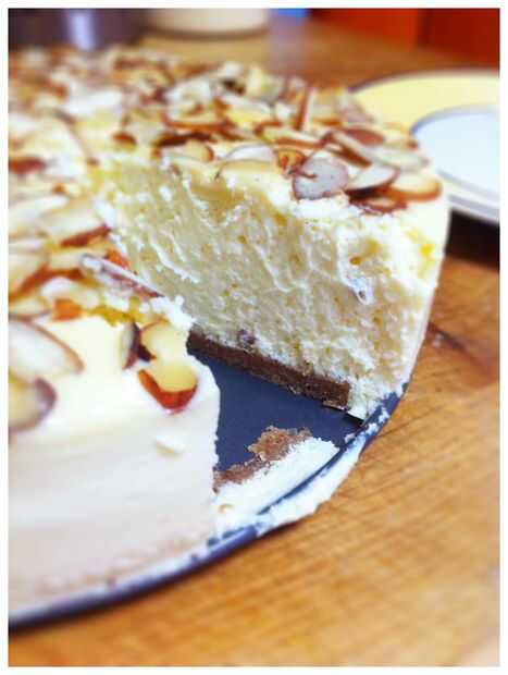 Vierte la mezcla del cheesecake sobre la corteza y encima con las almendras trituradas.
