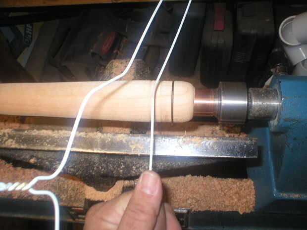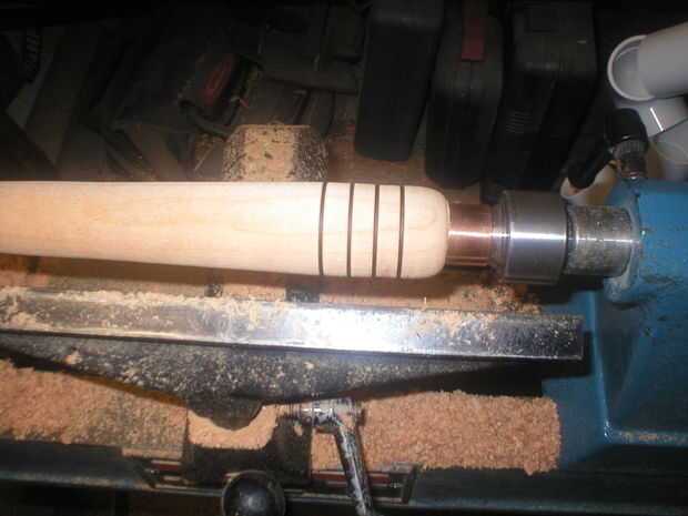 Así que tienen una forma agradable pero vamos a añadir algunos toques decorativos agradables para, en este punto puede hacer cualquier cosa, quizás añadir algunos surcos de dedo o cierta textura. Decidí hacer algunos quemado causa surcos se vean bien y mejorar el agarre de la herramienta. Me empieza con un sesgo o una punta de cincel y hacer algunos ligeros surcos en el hombro de la herramienta. Una vez que sus ranuras se cortan coger una percha y empuje suavemente en la ranura mientras el torno gira. Presione el gancho hasta conseguir una buena nube de humo y comprobarlo. Hacer las quemaduras como oscuro y profundo como quieras. He puesto ranuras en la parte delantera y trasera de la herramienta.