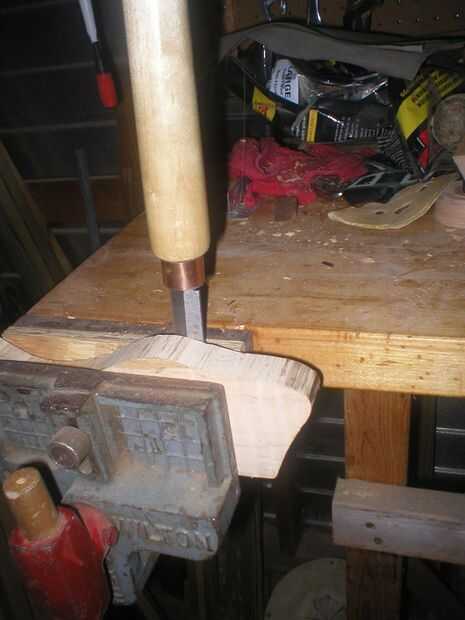 Finalmente encontró el paso perdido... ¿Cómo obtengo la herramienta en el mango? Ojala que ha perforado un agujero de tamaño ligeramente inferior en el mango en el paso anterior. Completa este paso usar un martillo pesado de cuero ante y mi banco de tornillo, el martillo de mar no la madera en el extremo de la manija y las mordazas de madera en la prensa que la herramienta limpio y reluciente. Si no tienes una prensa sólo Coloque la punta de la herramienta en una pieza de madera blanda y tratar de mantener cosas rectas mientras que libra juntos. Si no tienes un martillo de cara suave no desesperes, una vez más utilice un pedazo de madera suave de sacrificio para poner en el extremo del mango de la herramienta y luego usar un martillo normal. Así que esta cosa una buena golpeando, asegúrese de que la herramienta esté apretados y completamente asentados. No te preocupes si ha perforado demasiado grande podemos salvarlo, pruebe a cortar algunas pequeñas cuñas de madera en disco con la herramienta en el mango, también puede utilizar un epoxy 2 parte para sostener cosas apretadas.
