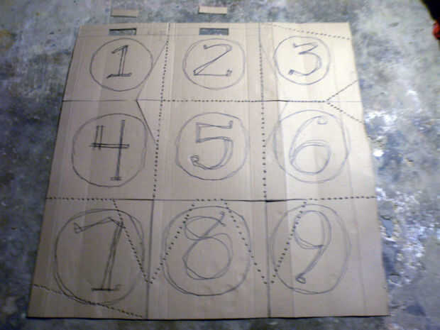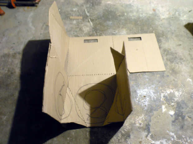 Corte ranuras en su caso y perforar las costuras que necesitan para ser doblado. Luego, doble plazas siete, ocho y nueve en las plazas, cuatro, cinco y seis. PIN siete a cuatro, ocho y cinco, y cinco a seis. Doblar 7/4 y 5/6 hasta noventa grados del 8/5. Doblar hacia fuera las aletas triangulares de siete, ocho y nueve, y deben superponerse. El perno a través de ellos para asegurar las patas.