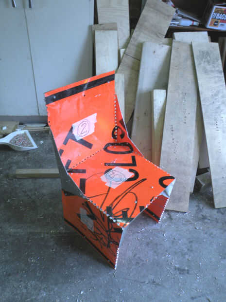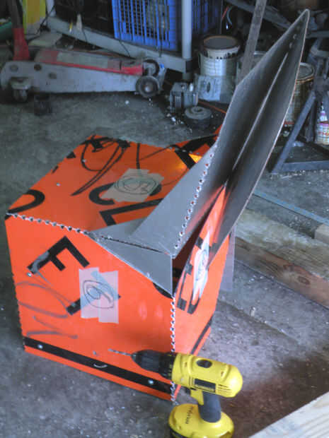 Para la espalda, doblar una plaza 180 grados para emparejar para arriba con sqaure dos. Perno a través. 1/2 a 90 grados para formar la parte posterior de la curva. Las aletas adheridas a esa pieza deben superponer sobre las aletas de la silla, Plaza número cinco.