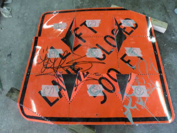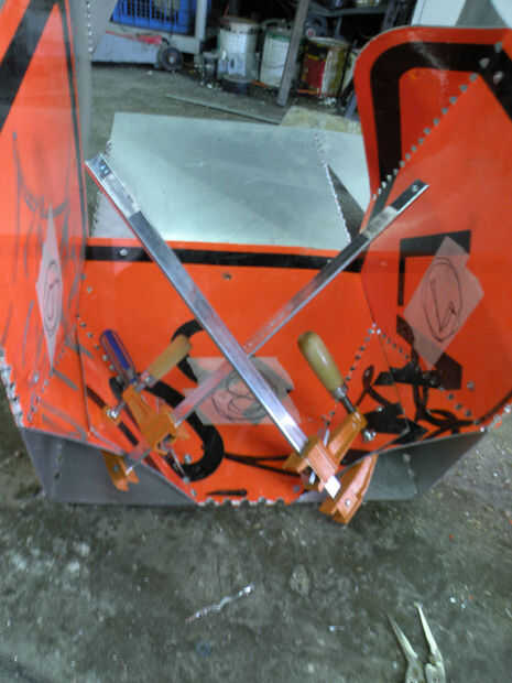 A continuación, doblar plazas siete, undeneath ocho y nueve plazas, cuatro, cinco y seis. Perforar y pin siete a cuatro, ocho a cinco, y nueve a seis, con número diez por 3/4 "tornillos largos de la máquina. 7/4 y 9 de la curva 6 a noventa grados. Las aletas que sobresalen de estos tres paneles se superpondrán. Taladre a través de la superposición y el perno para sujetar las piernas en su lugar.