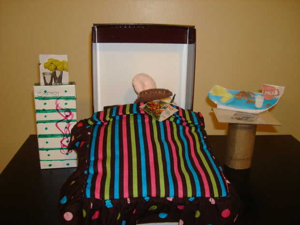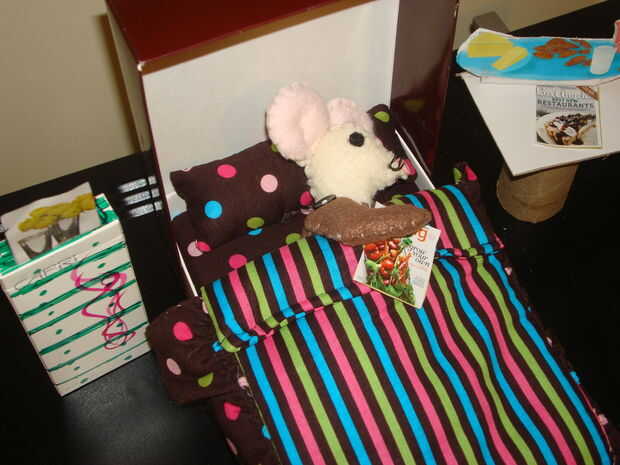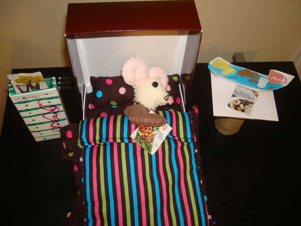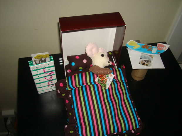 Esta guía es como hacer una miniatura cama y dormitorio utilizando un cartón cartón de la caja y la tapa, rollo de papel higiénico, paquete de cigarrillos, rotulador, espuma, retazos de tela, bateo, magazine cut outs y cinta. Los niños tendrán horas de diversión con esta cama de Linda muñeca. He incluido el patrón de ratón, pero esta guía no es acerca de cómo hacer que el ratón. Creo que las instrucciones del patrón están muy bien escritas.