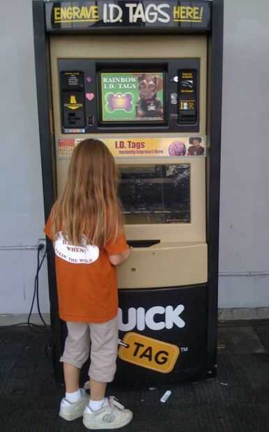 Encontrar una tienda que tiene una máquina expendedora para hacer modificado para requisitos particulares etiquetas de perro. Estas máquinas son más común de lo que imaginas, así que son bastante fáciles de encontrar. Grandes tiendas de mascotas son un buen lugar para buscar. Mi local PetSmart tiene uno. También lo hace en el Walmart por la calle. Las etiquetas cuestan unos US$ 5, incluyendo el grabado.