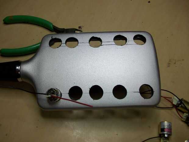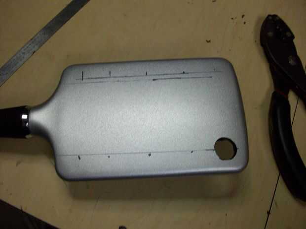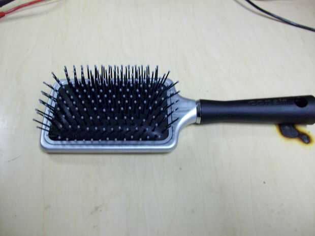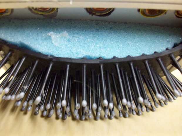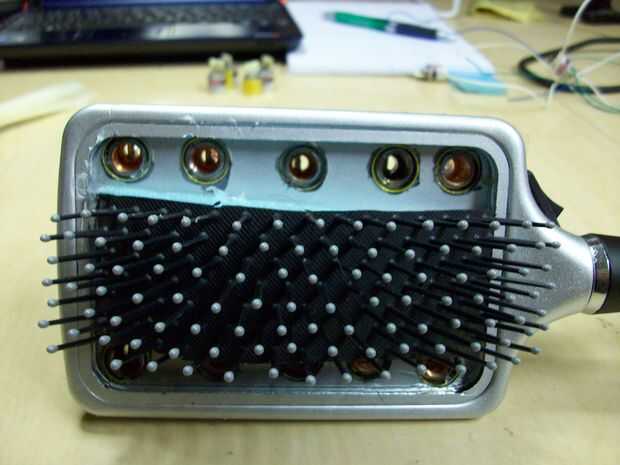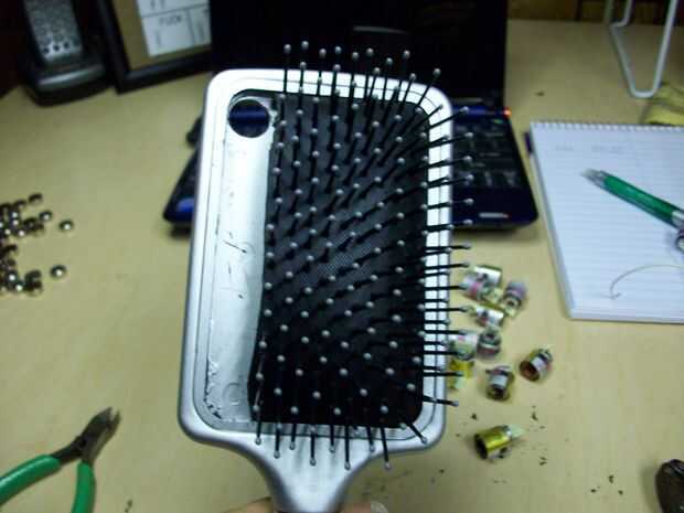 Medí cuidadosamente los agujeros a los lados para poner dos filas de láseres, entonces ignorado por completo las medidas y solo comentarlo. Luego dio la vuelta al cepillo y cortar las partes laterales de las cosas de dedo cepillo con una navaja. Decidí mantener la parte central, ya que parecía tener un cuero cabelludo masaje de efecto (que también va a ayudar a promover el flujo de sangre.) Con el fin de evitar contraer porque había comprometido su integridad estructural puse un pedazo de espuma semi rígido por debajo de ella y pegué.