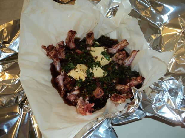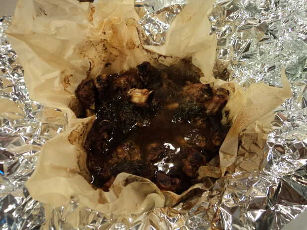3. Verter sobre las costillas, envuelva el papel alrededor de él todos.  Elegí una forma de beso dejó escapar apenas la cantidad correcta de vapor pero tener todos los sabores agradables en.