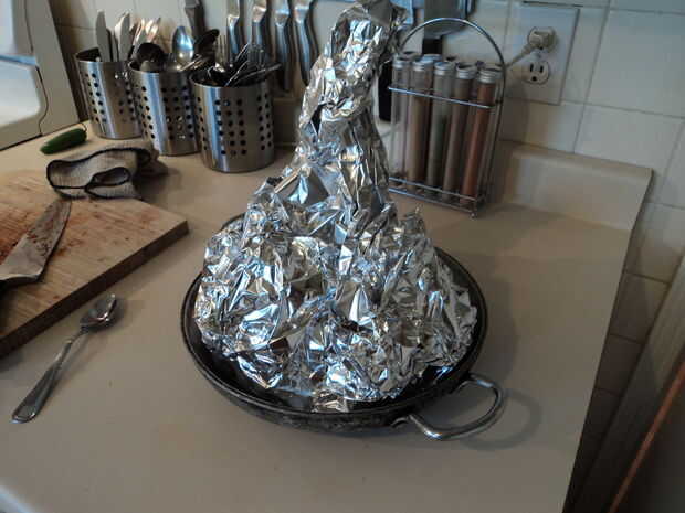5. Retire del horno y siempre tan cuidadoso tire hacia atrás la hoja.  Hace de vapor para una quemadura muy desagradable así que tenga cuidado, pinzas de cocina son excelentes para esto.  Dejar que enfríe lo suficiente como para manejar antes de continuar, como usted estará manipulando esto con las manos.