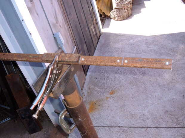Corte una pieza y con precisión, perfore los agujeros (diámetro 5/16"). Puede usar esto como guía para el diseño el equilibrio de las cuatro piezas idénticas. Estoy actualmente sin un metal chopsaw, usé una amoladora angular de 4 1/2" con una rueda de corte muy fino. La longitud de cada pieza fue marcada por la muestra en lugar de fijación y entonces anota la longitud, con la rueda de corte, había marcado los orificios en el taladro. De esta manera todos los agujeros son taladrados idénticamente. Los conjuntos fueron emparejados para arriba y marcados, se muestra en un cuadro más adelante.