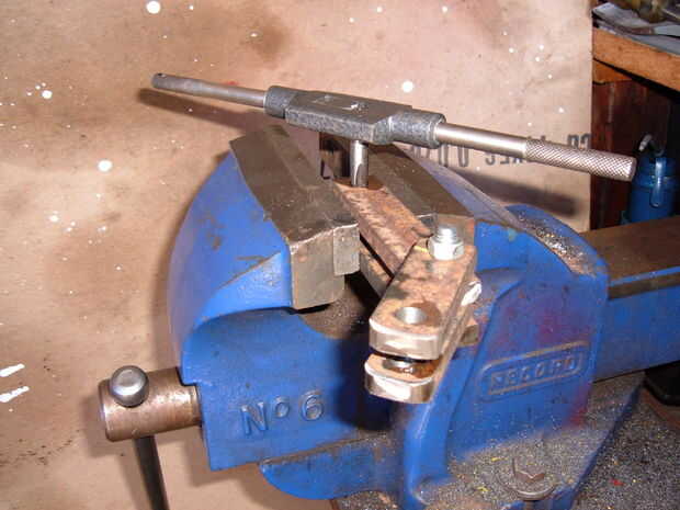 La primera foto (Intro) muestra un áspero conjunto de descanso a la derecha en busca y fue montada de esta manera para comprobar el ajuste y para marcar donde los hilos de rosca necesitan ser instalado. Esta fotografía muestra el procedimiento de roscado. El miembro superior ha sido ya taladrado a 3/8" diámetro.  y actúa como una guía fácil para mantener el grifo en curso y derecho...  El agujero del primer plano ya ha sido aprovechado.