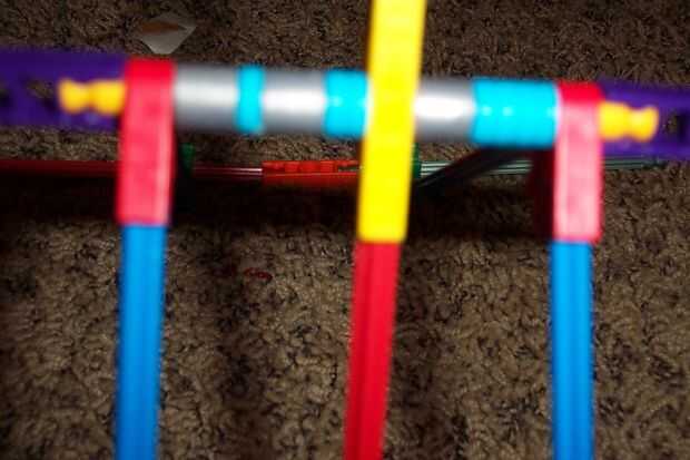 Bien ahora ponga el brazo en la barra amarilla de abajo, luego agregue los espaciadores necesarios en cada side.then ponen espaciadores púrpura en el extremo.