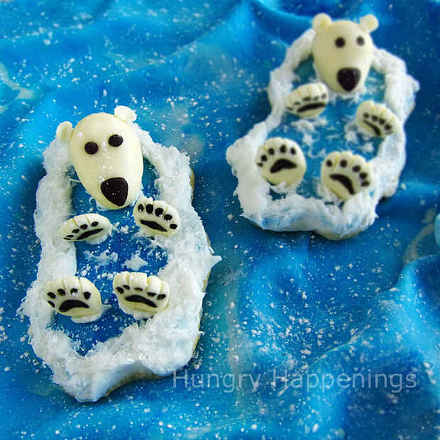 Estas galletas hará una gran adición a cualquier plato de galletas de vacaciones o invierno. Si desea vestir para arriba para la Navidad, puede Agregar un rojo y verde sombrero o dan a los osos polares una bola roja y verde para jugar con. Estas cookies hará grandes regalos si envueltas individualmente en bolsas de celofán transparente.