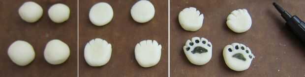 Para hacer las patas pellizcar apagado y rodar dos bolitas de color blanco y dos que son un poco más grandes. Aplanar las dos bolas más pequeñas y mantener en forma redonda. Aplane los dos pedazos más grandes lo que los hace más alargada. Utilice un cuchillo afilado para hacer cuatro cortes en cada pata de los dedos del pie. Use un marcador de colorante de alimentos negro para dibujar un punto en cada uno de los cinco dedos en cada pata y una almohadilla en cada pata. Deje que la tinta se seque antes de manipular las patas. Hacer cuatro patas para cada cookie oso.