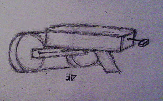 15F10: cadena Fed arma: una pistola con un tiro punta barra amplia huelga tres rondas a la vez. Dos ruedas giratorias se colocan a ambos lados de la pistola que es hecho girar alrededor de una cadena de cámaras por elásticos de la herida en una de las ruedas. Sugiero modificar el diseño de la BR-18 para esta arma. -por Oblivitus