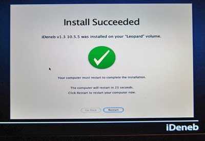 Una vez finalizada la instalación un círculo verde con una marca de verificación aparece diciendo que la instalación fue exitosa. Tendrá que reiniciar el ordenador (creo que puede hacer automáticamente si usted no está alrededor) y después pasa por el gestor de arranque de Darwin, otro Apple pantalla de carga aparece: