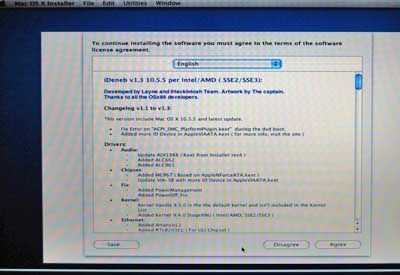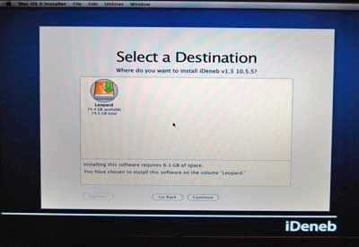 a continuación, aparecerá la pantalla de la imagen. Clic en Acepto continuar. Entonces la pantalla "Seleccione un destino" se están diciendo donde puede instalar Leopard. Debe mostrar la partición y unidad de disco duro le apenas formateado. Si no es así, entonces algo salió mal en el proceso de formateo, pero no se preocupe, todavía puede ir a la utilidad de disco y vuelva a intentarlo. (Tenga en cuenta que en esta foto se utiliza un icono de disco duro externo, a menos que usted está instalando en un disco externo, debe aparecer un icono de disco duro). Haga clic en instalar.