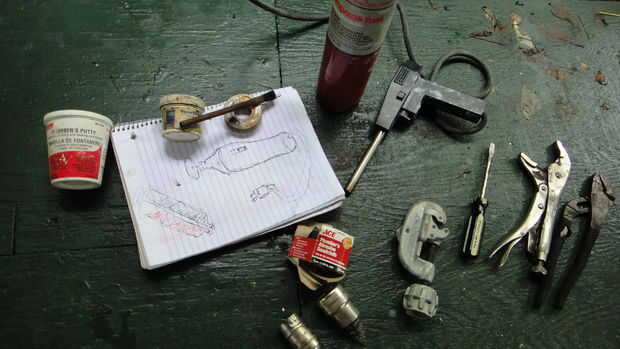 Diversas herramientas: herramientas de plomería, algo para tomar la quebrada, manejar un taladro con brocas, herramienta dremel y algunos epoxy.