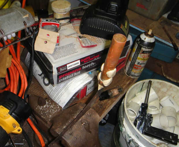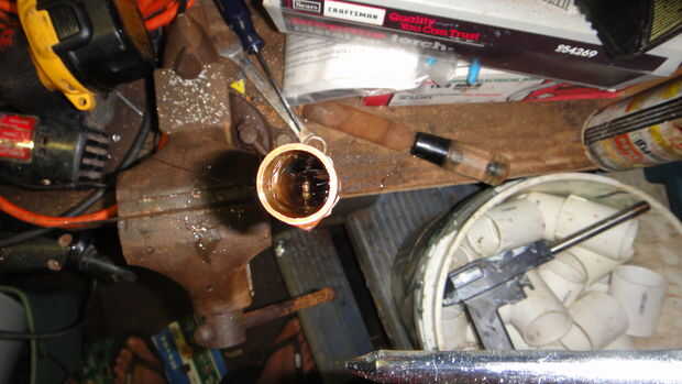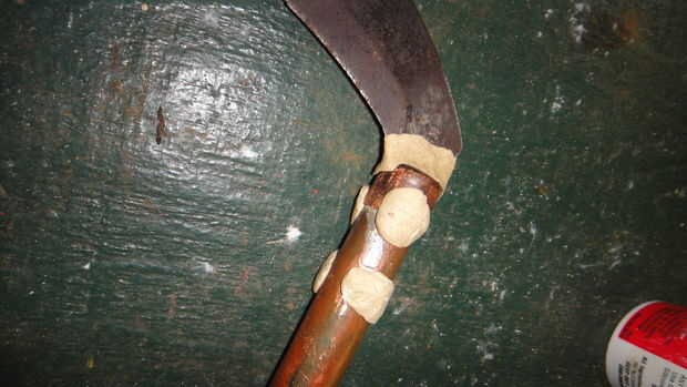 Ahora que la hoja en el mango, el tiempo para hacer es estable. Poner alguna masilla o cera de abejas alrededor de los remaches y donde la hoja se une con el cobre. Colocar el ensamblado para que el epóxido puede ir dentro y no caerse. Vertical es una muy buena forma. Utilicé un tornillo pero incluso apilar grava funcionará. Llenarla con epoxy y espere que se seque.