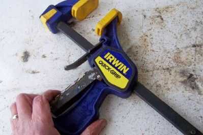 abrazaderas tipo C es grande, pero pueden dejar antiestéticas abolladuras a menos que use con una pieza de madera de desecho para evitar los golpes. Sin embargo, una pieza de madera de desecho casi requiere una tercera mano para mantenerlo en su luga