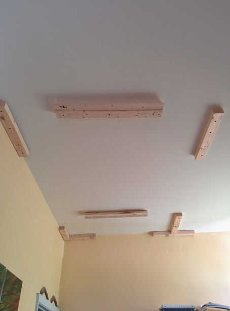 He decidido crear un techo suspendido que instalaría en mi techo existente con madera de 2 x 3. Desde el panel de yeso nunca se iba a llevar cualquier carga, no hacía falta instalar palos todo alrededor de la habitación. Pude crear los puntos de anclaje mediante 12"/ 18" cortes de 2 x 3. Este corte mi orden de madera abajo y me ahorró algo de dinero. :-)