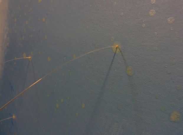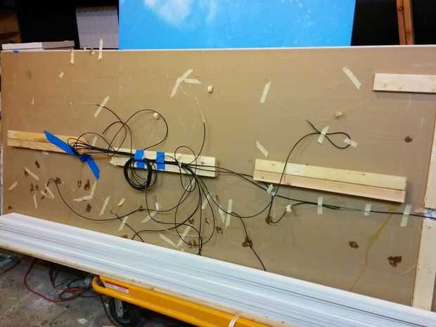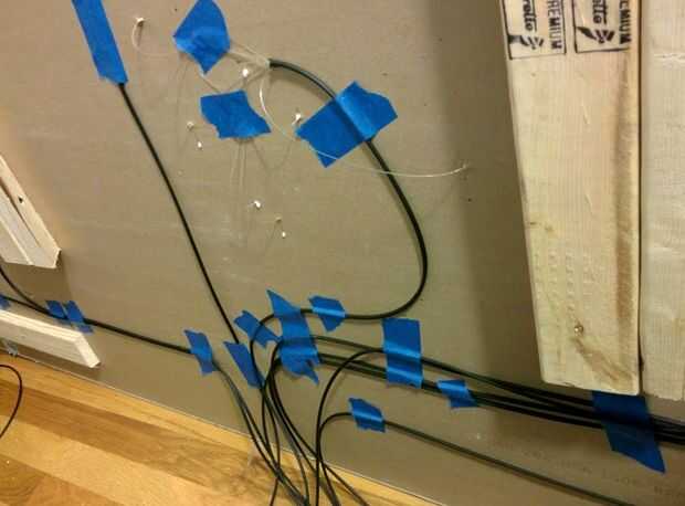 Para instalar las hebras de fibra en la pared me pareció que un clavo individual de una clavadora de 16 calibre lo suficientemente grande. Cada filamento fue de 0,75 mm. Golpee ligeramente justo en el clavo con un martillo del lado pintado (con el fin de hacer como limpiar un agujero como sea posible) y luego ejecutar la fibra a través de la parte posterior. Dejé un buen 6" colgando a través del lado pintada para asegurarse de que la fibra nunca echaron hacia atrás durante la instalación.