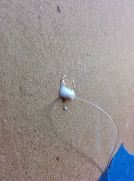 Cinta azul ayudó a mantener las rutas de cable limpio y en su lugar, y pegamento de Elmer regular fue suficiente para mantener la fibra en el agujero. Sólo secó una gota en la espalda y tiró de él hacia adelante y hacia atrás un par de veces para conseguir el pegamento en el agujero. Tiempo de secado llevó tal vez 10 minutos. Súper fácil!