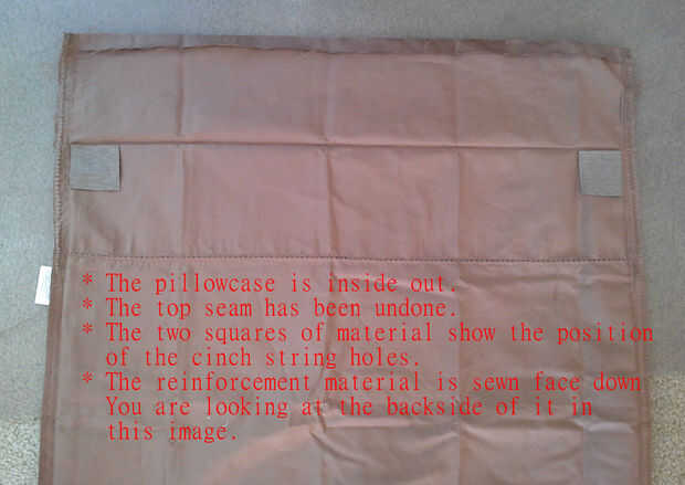 Recorte el material de refuerzo y coloque cara abajo en el interior del canal del cordaje. La imagen muestra la colocación adecuada del material de refuerzo, pero no se cose rápidamente. Sólo cose a través de una capa de la funda de almohada para colocar el refuerzo.