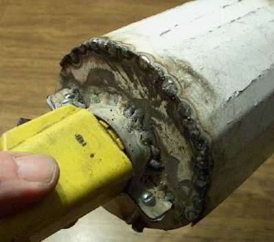 Quité la correa y el disco de la luz de problemas y realiza una serie de soldaduras de rumbo a lo largo de la longitud de la correa así que está muy bien colocado en el disco. Si tuviera un soldador MIG, pude hicieron apenas el ajuste correcto para hacer un cordón de soldadura continua, pero eso no es realmente posible en mi soldador de núcleo de fundente. Esto no es un proyecto de cosmético, de todas formas. Sin embargo, mi soldador de núcleo de fundente se cava a través de la pintura vieja y un poco de tierra para hacer una soldadura, mientras que el metal tendría que estar brillante y limpio para un soldador MIG trabajar.