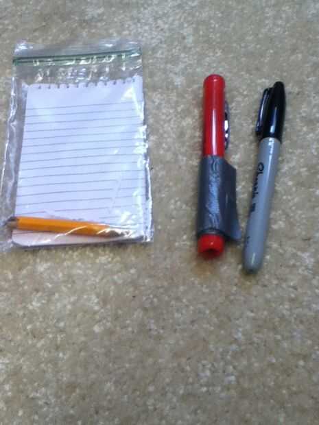 Bolsa mismo el refugio era en y detrás de él tengo un lápiz y papel. Un rotulador y una linterna. Hilo dental de materia médica apenas básicos plust