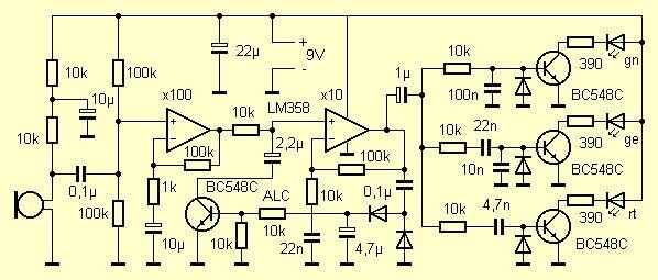 He encontrado en Internet los siguientes esquemas para órgano de luz LED ( http://www.b-kainka.de/bastel85.htm ). Tiene preamplificador de micrófono que en mi caso no era necesario - la radio ha construido en altavoz del amplificador.