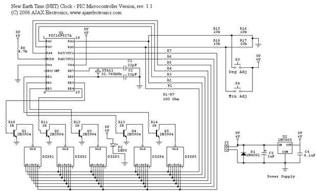 Al igual que cualquier reloj digital, el microcontrolador utiliza multiplexación por división de tiempo para controlar cinco displays de 7 segmentos de sólo 12 pines de I/O. Usted puede ver este esquema en internet, pero la idea básica es que es sólo una pantalla en cualquier momento pero nuestro ojo percibe todas las pantallas para estar al mismo tiempo debido a la persistencia de la visión. Las pantallas son conducidas por transistores 2N3904, puesto que los puertos de E/S del PIC no pueden hundirse suficiente corriente para el 7 LED.