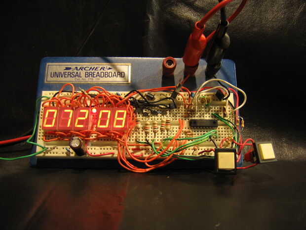 Además de la muestra, hay dos botones multiplexados en las salidas de pantalla para las funciones de ajuste de reloj. Un botón establece grados de red, la otra establece los minutos de red.