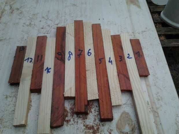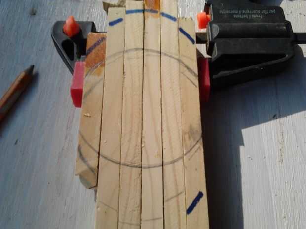 Con una plantilla en un círculo me encontré una primera medición cruda de seguimiento que he preferido; en mi caso fue de 160 mm de diámetro. Conocí a listones de tablero todo abeto y trazó la forma un círculo con dos biseles opuestos más pequeño. Entonces corrí con rompecabezas de cortes burdos según localización y tiene la estructura en la figura