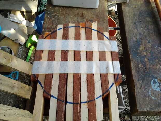 El siguiente paso consistió en apoyar uno al otro, alternando los listones y fijación temporalmente con cinta de papel para compactar archivos.