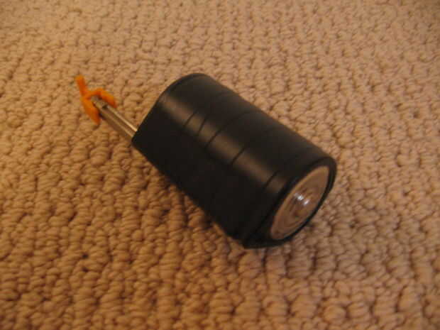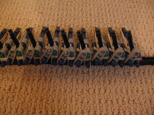 Esta cadena tira gren clavijas. La cadena se compone de pequeños dispositivos disparos. Usted puede tanto como tu quieras si tienes las piezas para construirlos. Eslabones de la cadena son de otro instructivo de alguien. Estos enlaces están equipadas con un pequeño dispositivo que tiene el verdes clavijas en su lugar. El gran cilindro negro es una pila D para ayudar a bajar la cadena cuando pasa a través de la pistola. Se graba en una clavija amarilla que es para mí una clavija de oro.