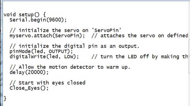 En segundo lugar, el servo se une al pin 9, con el servo adjuntar propiedad. Como un efecto secundario agradable, esta operación mueve el servo a su posición inicial, lo que equivale a los párpados, siendo la mitad cerrada. Es una indicación visual de que algo está pasando.