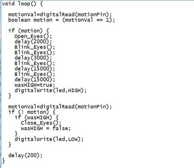 Si no había movimiento, y el estado previo era detectado (wasHigh == true), entonces los ojos se cierran. Las declaraciones se construyen de esta manera, para que la secuencia de movimientos siempre se completan.