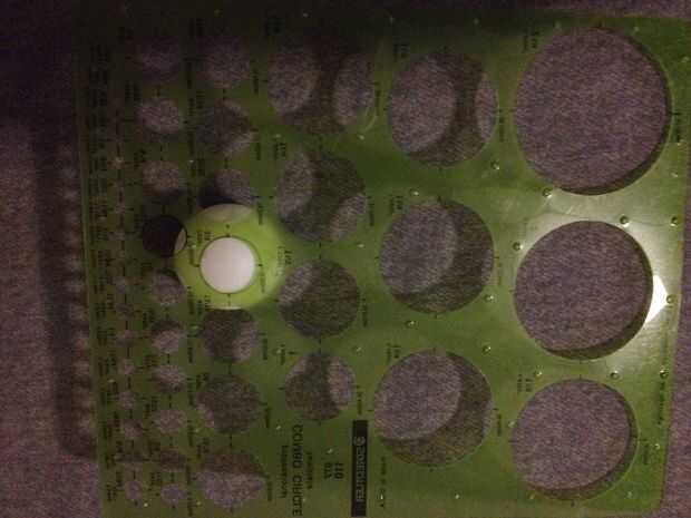 Entonces, a 90 grados a ese agujero, haga un agujero en la circunferencia con el diámetro de la barra de colada las utiliza para la T cuando los párpados (una buena razón para leer más adelante, cuando se trata de seguir las instrucciones). Utilizar una plantilla de círculo para determinar tamaño, circunferencia, ángulos y posición de las pelotas de ping pong.