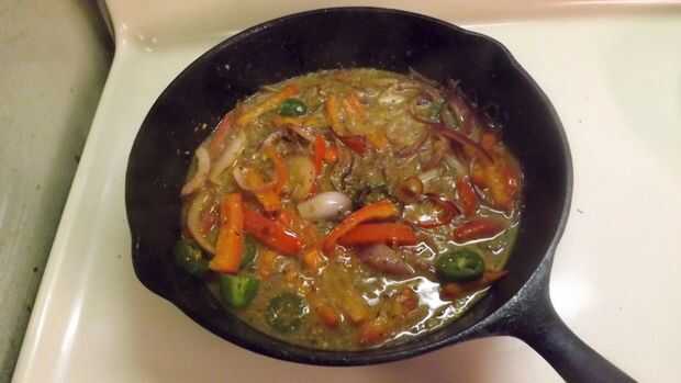 4. Añadir las cucharadas restantes de aceite a la sartén junto con los pimientos y cebolla y 1 cucharadita de tomillo seco. Saltear o sofrían hasta que las verduras comiencen a ablandar, 3 a 5 minutos (no quieres quemarlos).